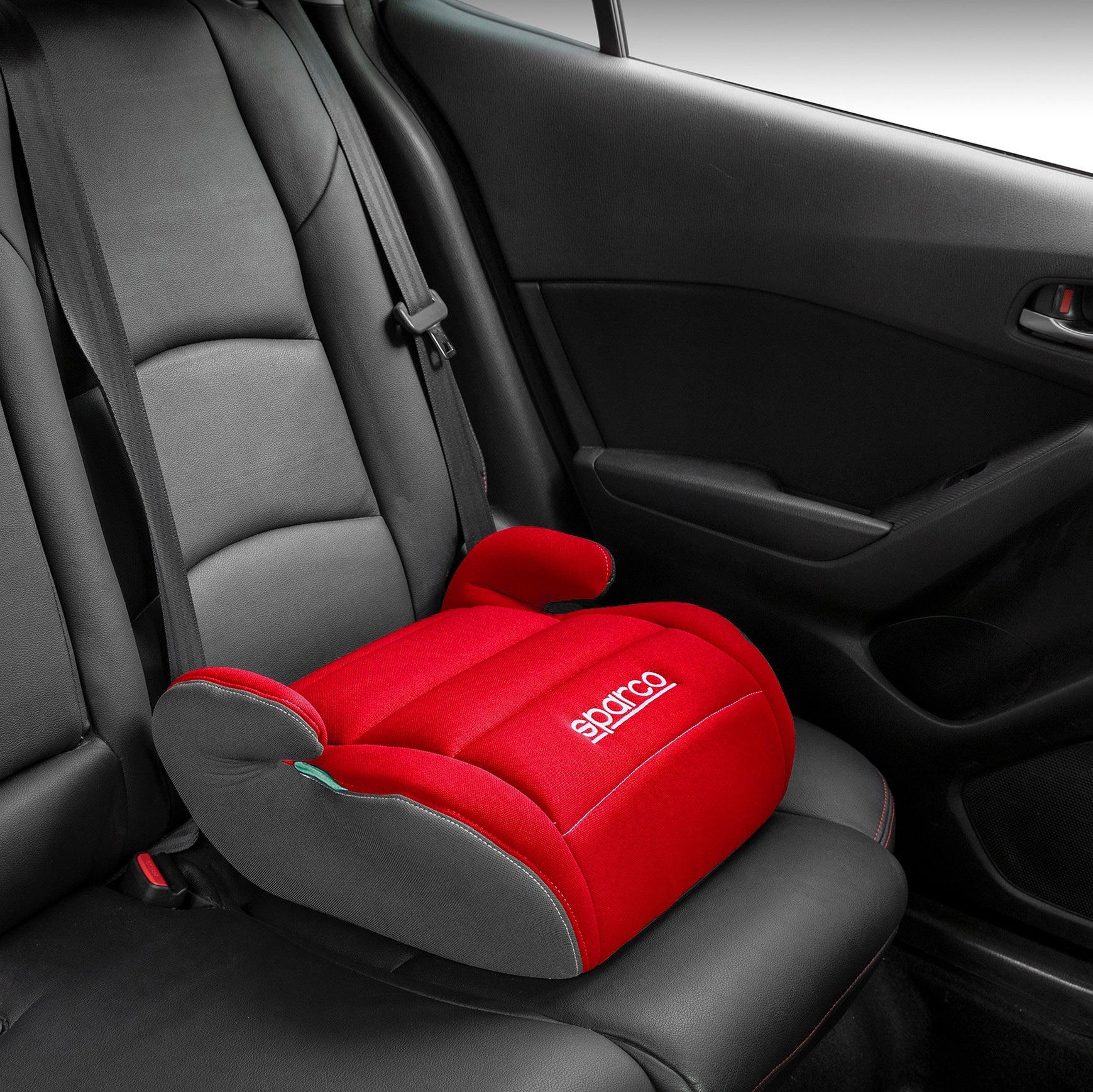 Sparco-logolla varustettu turvavyötyyny, joka sopii 125-150 cm:n pituisille lapsille, joiden paino on 22-36 kg.
