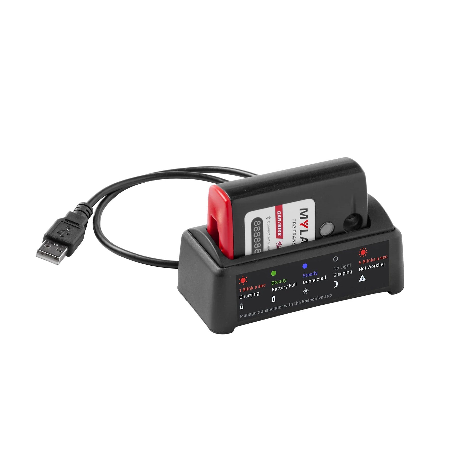 - Laddningsdocka ingår för laddning och anslutning till Speedhive-appen
